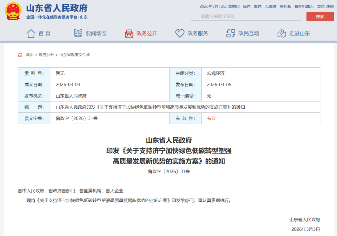 山东省人民政府印发《关于支持济宁加快绿色低碳转型塑强高质量发展新优势的实施方案》