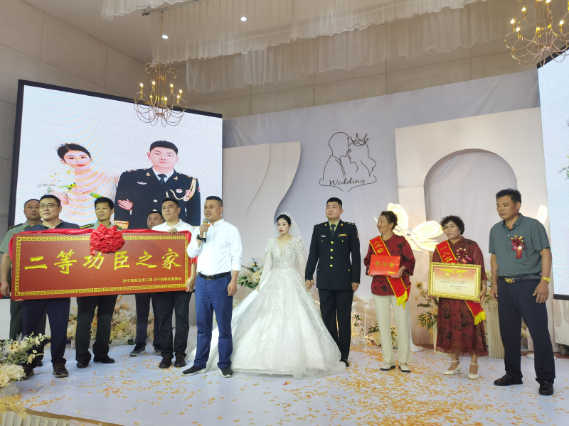 7月15日上午,随着一阵喜庆的锣鼓声,济宁市高新区一处婚礼现场,济宁高新区退役军人事务局、人民武装部为新郎、火箭军某部二级上士郑义送来新婚“贺礼”,立功喜报、“二等功臣之家”牌匾及荣誉奖励金。 二等功之家的牌匾在亲朋好友的注目下,送到了现役军人郑义和新娘刘森的手中。红花绶带遇上洁白的婚纱是专属于军人的浪漫。 2011年12月,郑义应征入伍,在火箭军某部服役。2022年,作为新闻报道员,执笔作剑,深耕宣传,撰写了一批有思想、有深度、有影响的精品力作,个人年度在解放军报等新闻媒体刊发稿件400余篇,有效传播了军营“好声音”,荣立个人二等功。 济宁高新区军地领导与二人进行亲切交谈,详细了解他在部队服役的基本情况和家庭生活状况,同时祝福这对新人,新婚快乐,希望他在强军兴军的伟大征程中积极进取、再接再厉、再立新功。 近期,济宁高新区发展软环境保障局退役军人事务部门持续开展送喜报活动,传递军地双方的温暖与关怀,切实提升军人军属的尊崇感荣誉感幸福感,营造“一人立功、全家光荣”的浓厚氛围激励广大青年积极参军入伍、报效祖国! |